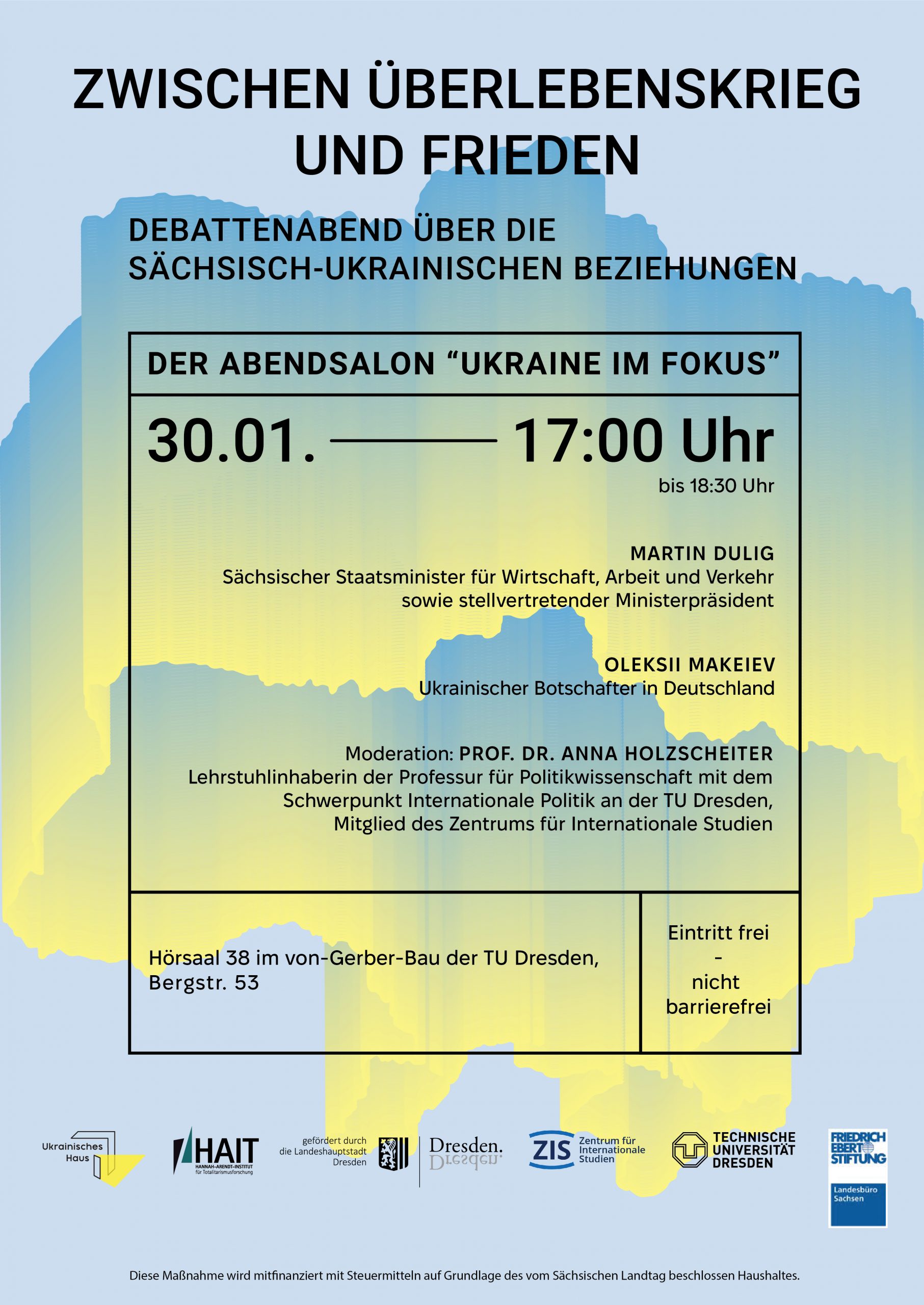 Über das bereits Geschaffte, aktuelle Herausforderungen und einen Ausblick in die Zukunft soll in einem Debattenabend der Veranstaltungsreihe „Ukraine im Fokus“ diskutiert werden. Organisiert wird die Kooperationsveranstaltung vom Ukrainischen Haus, einem Projekt des gemeinnützigen Vereins Plattform Dresden e.V., zusammen mit der TU Dresden, dem Zentrum für Internationale Studien, dem Hannah-Arendt-Institut für Totalitarismusforschung e.V. und der Friedrich-Ebert-Stiftung.
