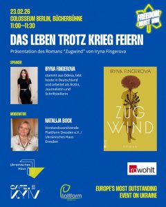 Bei der Veranstaltung liest Iryna Fingerova aus ihrem Buch und spricht über Odesa, den Krieg und das Leben zwischen zwei Welten. Die Lesung wird von Natalija Bock, Vorstandsvorsitzenden vom Plattform Dresden e.V. moderiert. Es gibt Raum für Fragen und Gespräche, auch an unserem Stand in der Nähe der Bücherbühne.