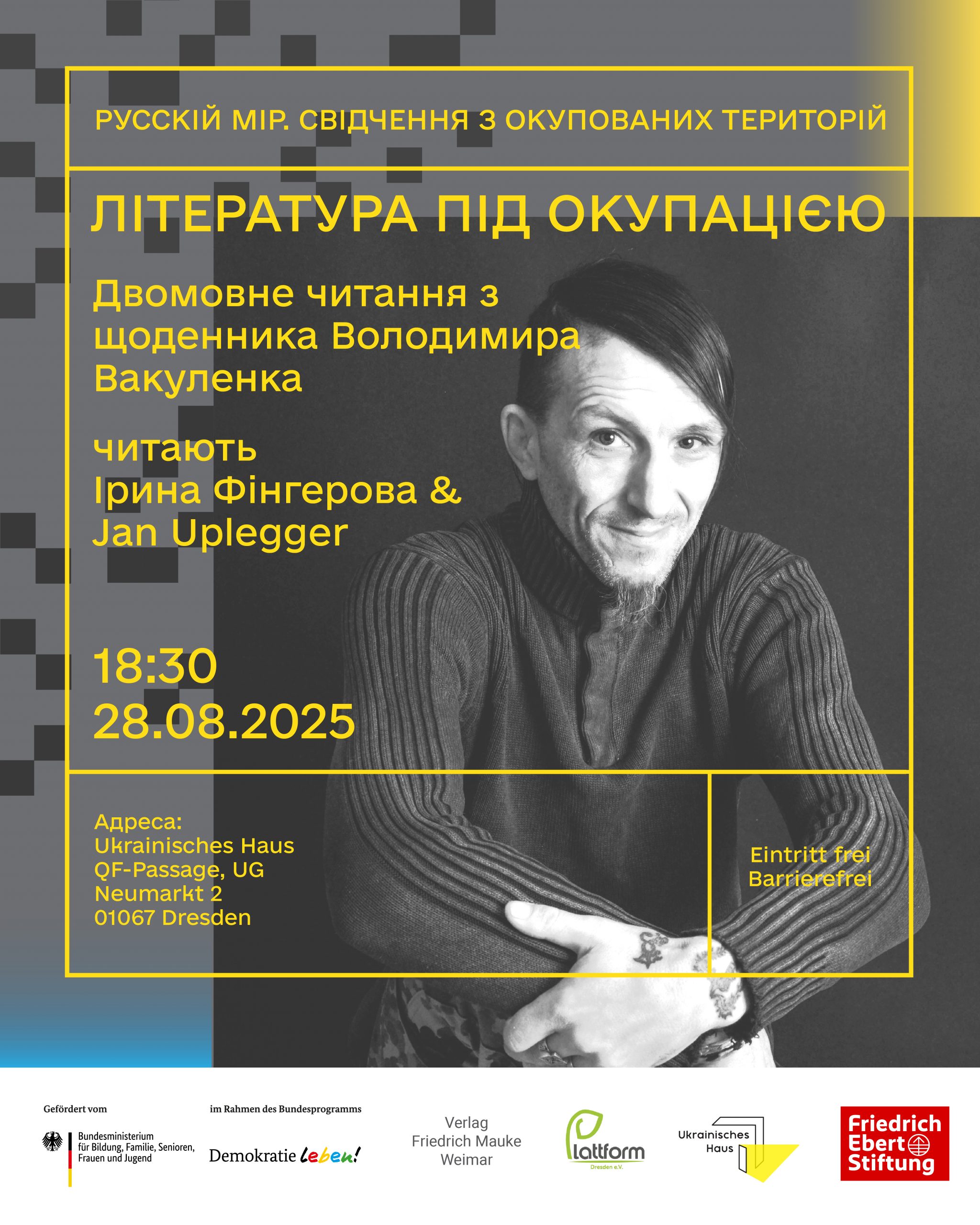 Читання відбуватиметься за участі актора Яна Уплеггера (німецькою мовою) та письменниці Ірини Фінгерової (українською мовою). Про значення української літератури в умовах окупації зробить доповідь видавець Андре Штьорр. Після читання відбудеться спільна дискусія про роль літератури у війні, міжнародну видимість українських авторів та виклики перекладу. Незалежно від ваших політичних поглядів – відкрийте для себе багатогранність української літератури й долучайтеся до відкритого діалогу про війну, мир і окупацію.
