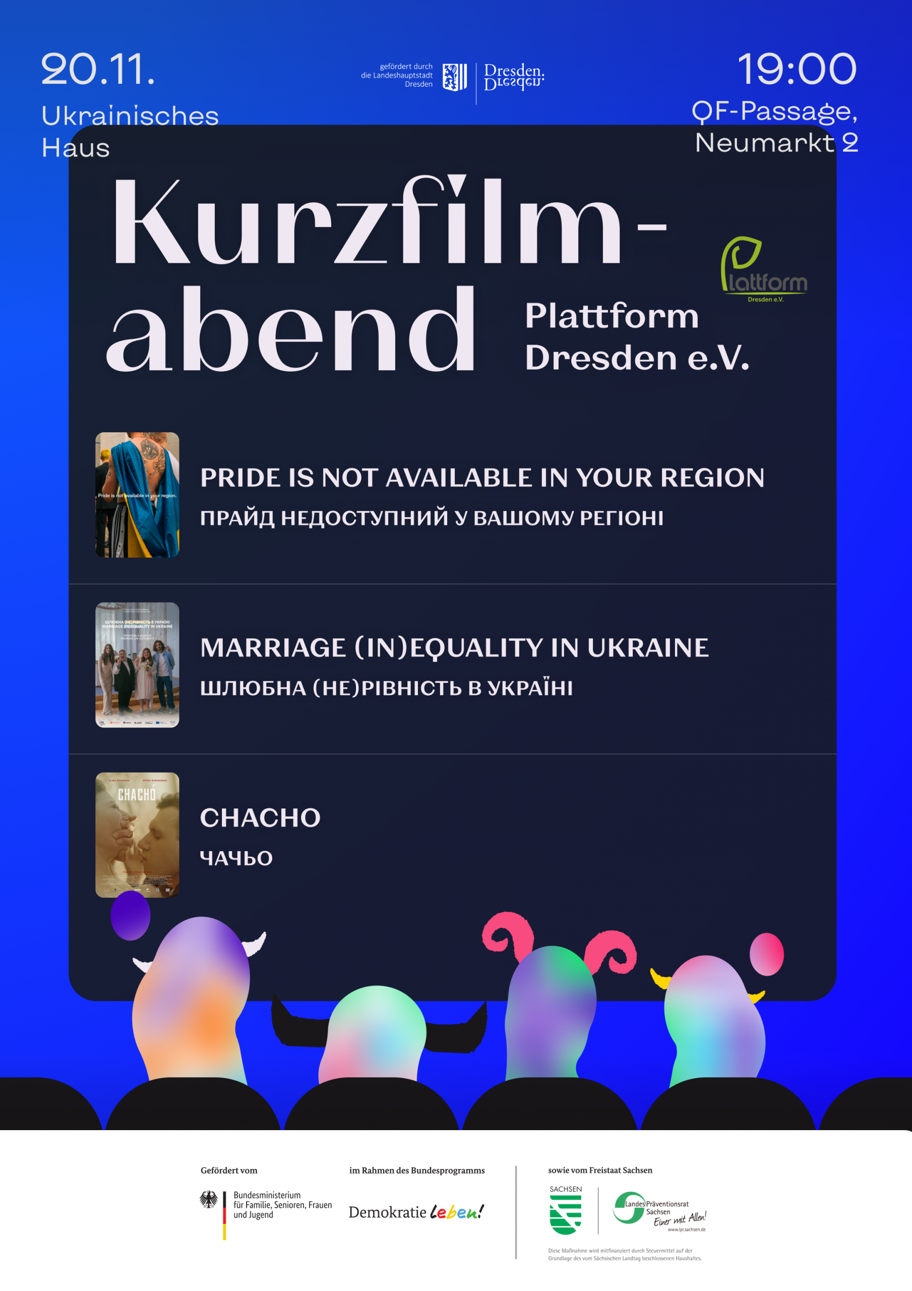 Unsere Kollegen, die sich mit den Themen Diskriminierung, Homophobie und Transphobie in der Ukraine befassen, haben mehrere Filme auf Ukrainisch mit englischen Untertiteln gedreht, die wir nicht nur zeigen, sondern auch zur Diskussion anregen möchten. Diese Veranstaltung ist für alle offen.