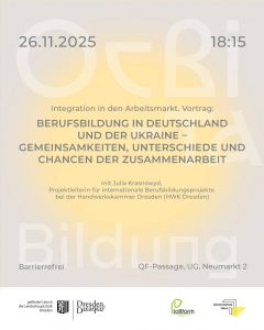 Wir laden ein zu einer Veranstaltung mit Julia Krasnowyd, Projektleiterin für internationale Berufsbildungsprojekte bei der Handwerkskammer Dresden (HWK Dresden).